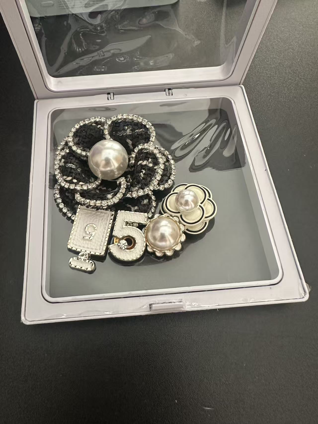Layered within the design is a signature No.5 charm, adding a touch of individuality and symbolic meaning—representing confidence, uniqueness, and timeless style. The contrast between textured fabric petals, smooth pearls, and refined metallic accents creates a look that feels both powerful and refined.